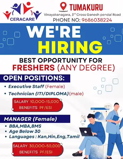 ತುಮಕೂರಿನ (Tumakuru) ವಿನಾಯಕನಗರದಲ್ಲಿರುವ ಸೆರಾ ಕೇರ್ (CERA CARE) ಕಂಪನಿಯಲ್ಲಿ ಕೆಲಸ ಮಾಡಲು ಯುವಕ ಮತ್ತು ಯುವತಿಯರು ಬೇಕಾಗಿದ್ದಾರೆ.
