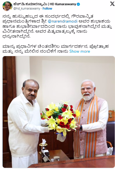 ಪ್ರಧಾನಿ ಮೋದಿ ತಮ್ಮ ಎಕ್ಸ್ ಖಾತೆಯಲ್ಲಿ ಕುಮಾರಸ್ವಾಮಿ ಅವರಿಗೆ ಹುಟ್ಟು ಹಬ್ಬದ ಶುಭಾಶಯವನ್ನು ತಿಳಿಸಿದರು. ಜನ್ಮದಿನಕ್ಕೆ ಶುಭಾಶಯ ಕೋರಿದ ಪ್ರಧಾನಿ ಮೋದಿ ಅವರಿಗೆ Kumarswamy ಧನ್ಯವಾದ ಅರ್ಪಿಸಿದ್ದಾರೆ. ಪ್ರಧಾನಿ ಅವರ ಶುಭಾಶೀರ್ವಾದಿಂದ ಭಾವುಕರಾಗಿರುವುದಾಗಿ ಕೇಂದ್ರ ಸಚಿವ ಹೇಳಿದರು.