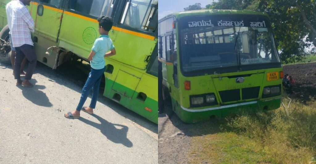 GADAG NEWS : ಗದಗದ ತಿಮ್ಮಾಪುರ ಗ್ರಾಮದ ಬಳಿ ಇಂದು ಬೆಳಿಗ್ಗೆ ಕುಕನೂರಿನಿಂದ ಗದಗದತ್ತ ಬರು ತ್ತಿದ್ದ ಖಾಸಗಿ ಬಸ್ನ ಮುಂದಿನ ಚಕ್ರ ಎಕ್ಸೆಲ್ ಕಟ್ ಆದ ಪರಿಣಾಮ ಬಸ್ನ ಚಕ್ರವೇ ಕಳಚಿದೆ. ಬಸ್ನಲ್ಲಿ ಸುಮಾರು 40 ಕ್ಕೂ ಅಧಿಕ ಪ್ರಯಾಣಿಕರಿದ್ದು ಯಾವುದೇ ಪ್ರಾಣಹಾನಿ ಸಂಭವಿಸಿಲ್ಲ.ಚಾಲಕನ ಸಮಯ ಪ್ರಜ್ಞೆಯಿಂದ ಪ್ರಯಾಣಿಕರು ಪ್ರಾಣಾಪಾಯದಿಂದ ಪಾರಾಗಿದ್ದಾರೆ