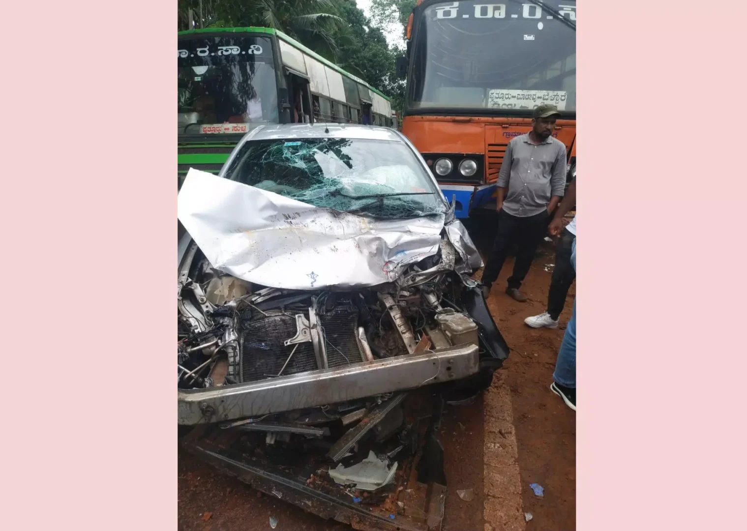 ಆರ್ಯಾಪು ಗ್ರಾಮದ ಸಂಟ್ಯಾರ್ ಎಂಬಲ್ಲಿ ಈ ಘಟನೆ ಸಂಭವಿಸಿದ್ದು, ಪುತ್ತೂರಿನಿಂದ ಬೆಳ್ಳಾರೆಯತ್ತ ತೆರಳುತ್ತಿದ್ದ KSRTC ಬಸ್ಸಿಗೆ ಸುಳ್ಯ ಕಡೆಯಿಂದ ಪುತ್ತೂರಿನತ್ತ ಬರುತ್ತಿದ್ದ ಕಾರು ಡಿಕ್ಕಿ ಹೊಡೆದಿದೆ. ಅಪಘಾತದ ರಭಸಕ್ಕೆ ಕಾರು ಸಂಪೂರ್ಣವಾಗಿ ನಜ್ಜುಗುಜ್ಜಾಗಿದೆ.