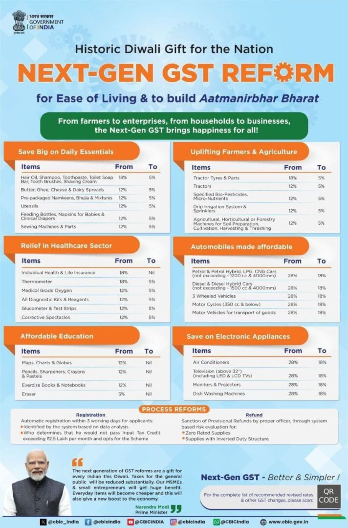 ಭಾರತ ಸರ್ಕಾರವು ಸೆಪ್ಟೆಂಬರ್ 22, 2025 ರಿಂದ ಹೊಸ ಜಿಎಸ್ಟಿ ಸ್ಲ್ಯಾಬ್ಗಳನ್ನು ಜಾರಿಗೆ ತಂದಿದ್ದು, ದೇಶದ ವ್ಯಾಪ್ತಿಯಲ್ಲಿ 375ಕ್ಕೂ ಹೆಚ್ಚು ವಸ್ತುಗಳು ಮತ್ತು ಸೇವೆಗಳ ಮೇಲೆ ತೆರಿಗೆ ದರಗಳಲ್ಲಿ ಪ್ರಮುಖ ಬದಲಾವಣೆ ಸಂಭವಿಸಿದೆ. ಈ ನಿರ್ಧಾರದ ಮೂಲಕ ಗ್ರಾಹಕರಿಗೆ ನೇರ ಲಾಭ ನೀಡುವ ಉದ್ದೇಶವಿದ್ದು, ಕೆಲವೊಂದು ವಸ್ತುಗಳು ಅಗ್ಗವಾಗುತ್ತವೆ, ಆದರೆ ಐಷಾರಾಮಿ ಸರಕುಗಳು ಮತ್ತು ಕೆಲವು ಹೆಚ್ಚಿನ ಮೌಲ್ಯದ ವಸ್ತುಗಳಲ್ಲಿ ತೆರಿಗೆ ಏರಿಕೆ ಮುಂದುವರಿಯಲಿದೆ.