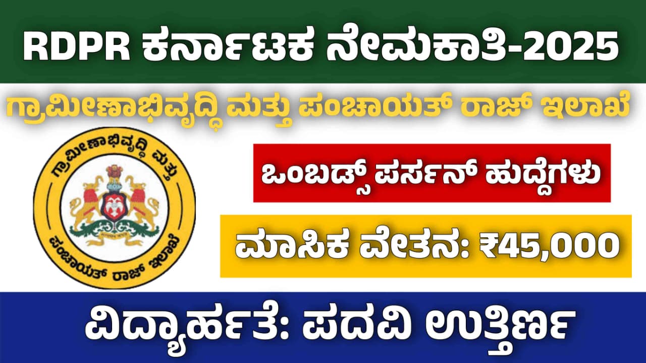 ಕರ್ನಾಟಕ ಸರ್ಕಾರದ ಗ್ರಾಮೀಣಾಭಿವೃದ್ಧಿ ಮತ್ತು ಪಂಚಾಯತ್ರಾಜ್ (RDPR) ಇಲಾಖೆ 2025 ನೇ ಸಾಲಿಗೆ ಒಂಬಡ್ಸ್ಪರ್ಸನ್ ಹುದ್ದೆಗಳ ನೇಮಕಾತಿಗೆ ಅಧಿಕೃತ ಅಧಿಸೂಚನೆ ಬಿಡುಗಡೆ ಮಾಡಿದೆ. ಸರ್ಕಾರಿ ಉದ್ಯೋಗಾಕಾಂಕ್ಷಿಗಳಿಗೆ ಇದು ಉತ್ತಮ ಅವಕಾಶ. ಅರ್ಜಿ ಸಲ್ಲಿಕೆ ಪ್ರಕ್ರಿಯೆ ಈಗಲೇ ಆರಂಭವಾಗಿದೆ ಮತ್ತು ಆಸಕ್ತಿ ಹೊಂದಿರುವ ಅಭ್ಯರ್ಥಿಗಳು ಅಧಿಕೃತ ವೆಬ್ಸೈಟ್ ಮೂಲಕ ಅರ್ಜಿ ಸಲ್ಲಿಸಬಹುದು.