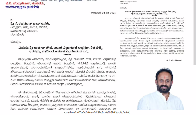 ಪಕ್ಷದ ಘನತೆಗೆ ಧಕ್ಕೆ ತಂದಿರುವ ರಾಜೀವ್ ಗೌಡ ಅವರನ್ನು ತಕ್ಷಣವೇ ಪಕ್ಷದಿಂದ ಅಮಾನತು ಮಾಡುವಂತೆ ಅಗತ್ಯ ಕ್ರಮ ಕೈಗೊಳ್ಳಬೇಕೆಂದು ಕೆಪಿಸಿಸಿ ಕಾರ್ಯಧ್ಯಕ್ಷ ಚಂದ್ರಶೇಖರ್ ಅವರು ಶಿಸ್ತು ಸಮಿತಿ ಅಧ್ಯಕ್ಷ ರೆಹಮಾನ್ ಖಾನ್ ಅವರಿಗೆ ಪತ್ರ ಬರೆದಿದ್ದಾರೆ.