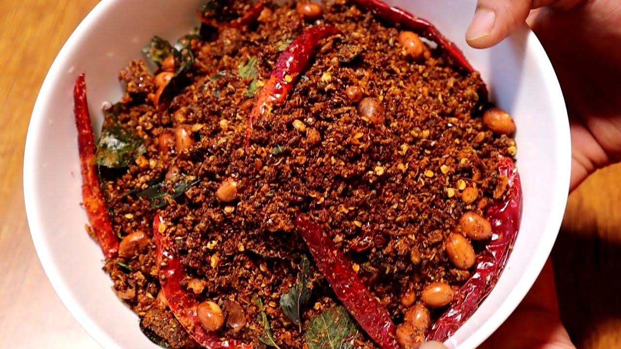 ಬಾಣಲೆಯಲ್ಲಿ ಸ್ವಲ್ಪ ಎಣ್ಣೆ ಹಾಕಿ, ಮೆಣಸಿನಕಾಯಿ, ದನಿಯಾ, ಮೆಂತ್ಯೆ, ಜೀರಿಗೆ ಮತ್ತು ಕರಿಬೇವು ಹುರಿಸಿ. - ತಣ್ಣಗಾದ ನಂತರ ಪುಡಿ ಮಾಡಿ: