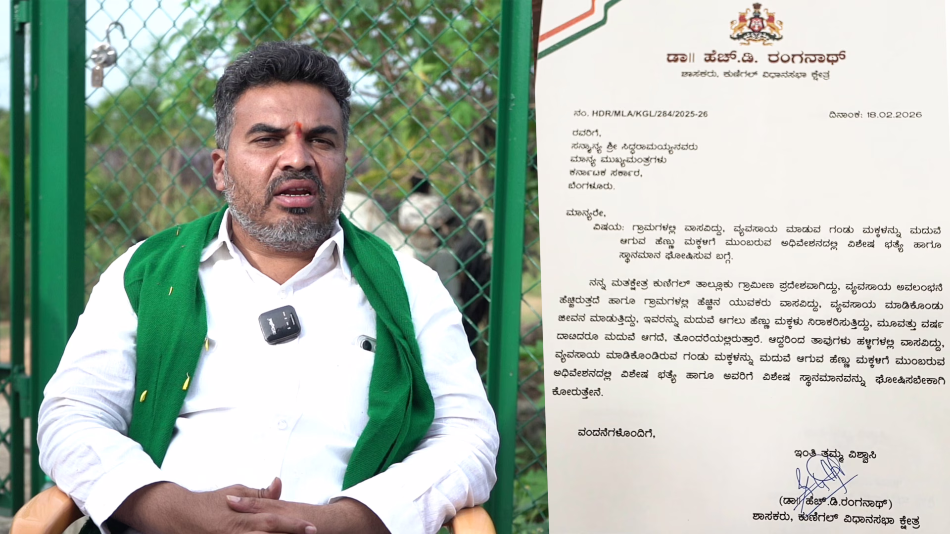 ರೈತರನ್ನು ಮದುವೆಯಾಗುವ ಹೆಣ್ಣುಮಕ್ಕಳಿಗೆ ವಿಶೇಷ ಭತ್ಯೆ ನೀಡುವಂತೆ ಕುಣಿಗಲ್ ಶಾಸಕ ರಂಗನಾಥ್ ಅವರು Ranganath ಅವರಿಗೆ ಪತ್ರ ಬರೆದಿದ್ದಾರೆ.