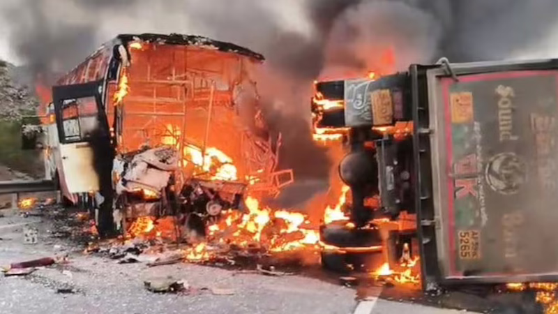 ಹರಿಕೃಷ್ಣ ಟ್ರಾವೆಲ್ಸ್ಗೆ ಸೇರಿದ ಈ ಖಾಸಗಿ ಬಸ್ ತೆಲಂಗಾಣದ ನಿರ್ಮಲ್ನಿಂದ ನೆಲ್ಲೂರಿನತ್ತ ಪ್ರಯಾಣಿಸುತ್ತಿತ್ತು. ಇದೇ ವೇಳೆ ಜಲ್ಲಿ ತುಂಬಿದ್ದ ಟಿಪ್ಪರ್ಗೆ ಡಿಕ್ಕಿ ಹೊಡೆದಿದೆ. ಇನ್ನು ಡಿಕ್ಕಿಯ ಹೊಡೆದ ತೀವ್ರತೆಗೆ ಬಸ್ ತಕ್ಷಣವೇ ಬೆಂಕಿಗೆ ಆಹುತಿಯಾಗಿ, ಕ್ಷಣಾರ್ಧದಲ್ಲಿ ಹೊತ್ತಿ ಉರಿದಿದೆ.