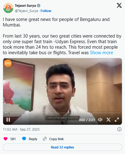 ಇದೆ ಸಂದರ್ಭದಲ್ಲಿ, ತೇಜಸ್ವಿ ಸೂರ್ಯ ಪ್ರಧಾನಿ ನರೇಂದ್ರ ಮೋದಿ, ಕೇಂದ್ರ ರೈಲ್ವೆ ಸಚಿವ ಅಶ್ವಿನಿ ವೈಷ್ಣವ್ ಹಾಗೂ ರಾಜ್ಯ ರೈಲ್ವೆ ಖಾತೆ ಸಚಿವೆ ವಿ.ಸೋಮಣ್ಣಗೆ ಕನ್ನಡಿಗರ ಪರವಾಗಿ ಹೃತ್ಪೂರ್ವಕ ಧನ್ಯವಾದಗಳನ್ನು ತಿಳಿಸಿದರು.