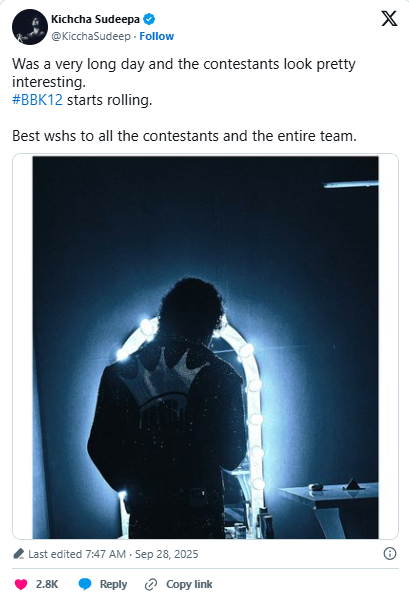“ಈ ದಿನ ತುಂಬ ದೀರ್ಘವಾಗಿತ್ತು. ಎಲ್ಲ ಸ್ಪರ್ಧಿಗಳು ಇಂಟರೆಸ್ಟಿಂಗ್ ಆಗಿದ್ದಾರೆ. ಬಿಗ್ ಬಾಸ್ ಕನ್ನಡ ಸೀಸನ್ 12 ಆರಂಭ ಆಗಿದೆ. ಇಡೀ ತಂಡಕ್ಕೆ ಮತ್ತು ಎಲ್ಲ ಸ್ಪರ್ಧಿಗಳಿಗೆ ಶುಭವಾಗಲಿ” ಎಂದು ಪೋಸ್ಟ್ ಮಾಡಿದ್ದಾರೆ.