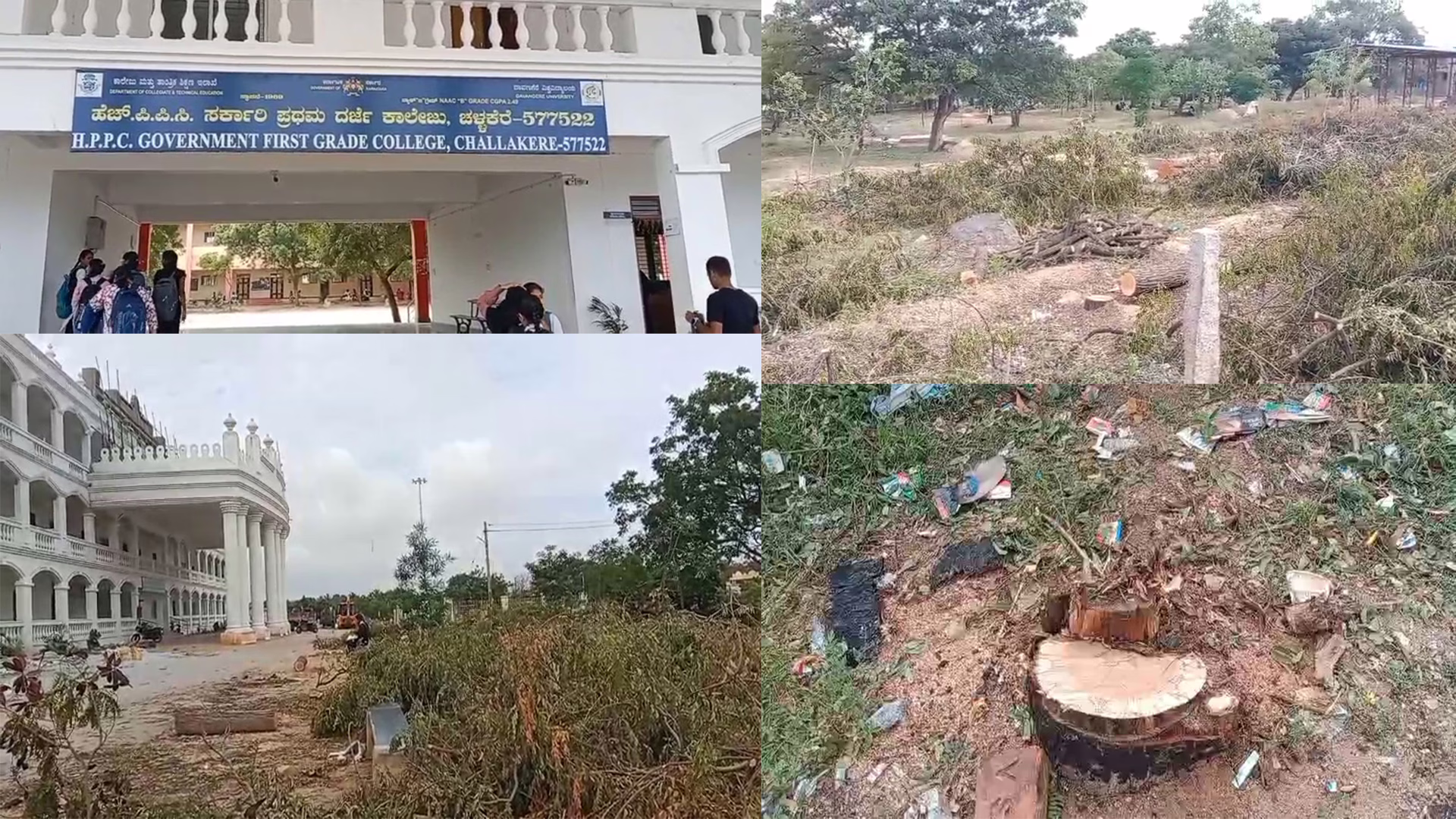 Hundreds of trees on the college campus were axed in Chitradurga : ರಸ್ತೆ ಅಗಲೀಕರಣ ನೆಪವೊಡ್ಡಿ ಹತ್ತಾರು ವರ್ಷಗಳಿಂದ ಕಷ್ಟಪಟ್ಟು ಬೆಳೆಸಿದ್ದ 100 ಕ್ಕೂ ಹೆಚ್ಚು ಮರಗಳಿಗೆ ಅಧಿಕಾರಿಗಳು ಕೊಡಲಿ ಪೆಟ್ಟು ಹಾಕ್ತಿದ್ದು, ಸಾರ್ವಜನಿಕರ ಆಕ್ರೋಶಕ್ಕೆ ಕಾರಣವಾಗಿದೆ. ಹೌದು ಅರಣ್ಯ ಇಲಾಖೆ ಅಧಿಕಾರಿಗಳ ದಿವ್ಯನಿರ್ಲಕ್ಷದಿಂದ ಜೆಸಿಬಿ, ಇಟಾಚಿ ಮೂಲಕ ಮರಗಳನ್ನು ಕಡಿಯುತ್ತಿದ್ದು, ಪರಿಸರ ನಾಶಕ್ಕೆ ನಾಂದಿ ಹಾಡುತ್ತಿದ್ದಾರೆ ಎಂದು ಚಿತ್ರದುರ್ಗದಲ್ಲಿ ಜನರು ಆಕ್ರೋಶ ಹೊರಹಾಕುತ್ತಿದ್ದಾರೆ.