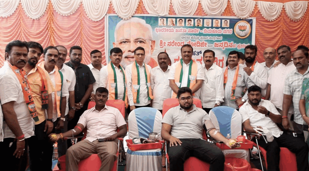 ಇತ್ತ ಪ್ರಧಾನಿ ನರೇಂದ್ರ ಮೋದಿ ಅವರ 75ನೇ ಜನ್ಮ ದಿನದ ಅಂಗವಾಗಿ ತುಮಕೂರು ಗ್ರಾಮಾಂತರ ಶಾಸಕ ಬಿ. ಸುರೇಶ್ ಗೌಡ ಅವರು ವಿಶ್ವವಿದ್ಯಾನಿಲಯದ ಮುಂಭಾಗ ಬೃಹತ್ ರಕ್ತದಾನ ಶಿಬಿರವನ್ನು ಆಯೋಜನೆ ಮಾಡಲಾಗಿತ್ತು. ಪ್ರಧಾನ ಮಂತ್ರಿ ಮೋದಿಗೆ 75 ವರ್ಷದ ಸಂಭ್ರಮ ಹಿನ್ನೆಲೆ 75 ಯೂನಿಟ್ ರಕ್ತ ಸಂಗ್ರಹಿಸುವ ಗುರಿಯೊಂದಿಗೆ ರಕ್ತದಾನ ಶಿಬಿರವನ್ನು ಆಯೋಜನೆ ಮಾಡಲಾಗಿತ್ತು. ಈ ವೇಳೆ ಶಾಸಕ ಸುರೇಶ್ ಗೌಡ ಅವರೇ ಸ್ವತಃ ರಕ್ರದಾನ ಮಾಡುವ ಮೂಲಕ ರಕ್ತದಾನ ಶಿಬಿರಕ್ಕೆ ಚಾಲನೆ ನೀಡಿದ್ರು. ಅಲ್ದೇ ಇಂದಿನಿಂದ ಅಕ್ಟೋಬರ್ 2ರವರೆಗೆ ಅಕ್ಟೋಬರ್ 2ರವರೆಗೂ ವಿವಿಧ ಸೇವಾ ಕಾರ್ಯಗಳನ್ನು ಶಾಸಕ ಸುರೇಶ್ ಗೌಡ ಅವರು ಹಮ್ಮಿಕೊಳ್ಳಲಾಗಿದೆ. ಇನ್ನು ಮೋದಿ ಜನ್ಮ ದಿನದ ಅಂಗವಾಗಿ ಆಯೋಜನೆ ಆಗಿದ್ದ ರಕ್ತದಾನ ಶಿಬಿರದಲ್ಲಿ ಶಾಸಕ ಜ್ಯೋತಿ ಗಣೇಶ್, ಜಿಲ್ಲಾ ಅಧ್ಯಕ್ಷ ರವಿ ಹೆಬ್ಬಾಕ, ನಗರಾಧ್ಯಕ್ಷ ಧನುಷ್, ಬಿಜೆಪಿ ಯುವ ಮೋರ್ಚಾ ಅಧ್ಯಕ್ಷ ಚೇತನ್, ಸೇರಿ ನೂರಾರು ಕಾರ್ಯಕರ್ತರು ಭಾಗಿಯಾಗಿದ್ರು.
