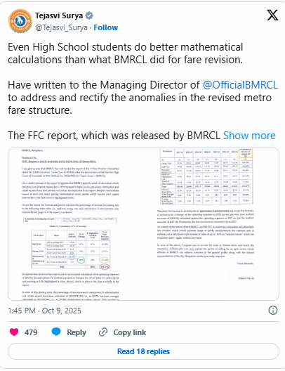 ತೇಜಸ್ವಿ ಸೂರ್ಯ ತಮ್ಮ ಪತ್ರದಲ್ಲಿ, ಮೆಟ್ರೋ ದರ ಪರಿಷ್ಕರಣೆಯಲ್ಲಿ ಆಗಿರುವ ಲೆಕ್ಕದ ತಪ್ಪುಗಳನ್ನು ಗಂಭೀರವಾಗಿ ಖಂಡಿಸಿದ್ದಾರೆ. “ಹೈಸ್ಕೂಲ್ ವಿದ್ಯಾರ್ಥಿಗಳೂ ಇಷ್ಟು ಕಚ್ಚಾ ಲೆಕ್ಕ ಮಾಡಲ್ಲ” ಎಂದು ಬಿಎಂಆರ್ಎಸಿಎಲ್ಗೆ ತೀವ್ರ ವ್ಯಂಗ್ಯವಾಡಿದ್ದಾರೆ.