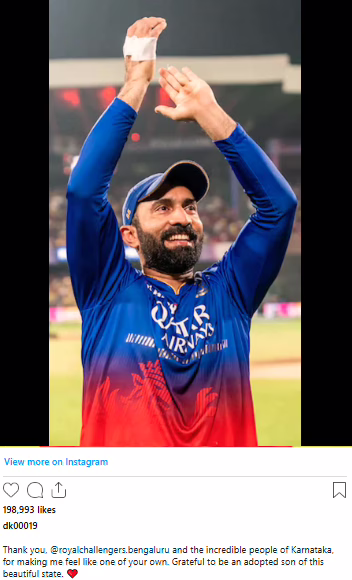 RCB ಕೋಚ್ ದಿನೇಶ್ ಕಾರ್ತಿಕ್ ಕನ್ನಡ ನೆಲ, ಜಲ, ಸಂಸ್ಕೃತಿಯನ್ನು ಬಣ್ಣಿಸಿ ಒಂದು ವಿಶೇಷ ವೀಡಿಯೋವನ್ನು ಇನ್ಸ್ಟಾಗ್ರಾಮ್ನಲ್ಲಿ ಪೋಸ್ಟ್ ಮಾಡಿದ್ದಾರೆ. ವೀಡಿಯೋದಲ್ಲಿ ಅವರು ಕರ್ನಾಟಕದ ಜನತೆಗೆ ರಾಜ್ಯೋತ್ಸವದ ಶುಭಾಶಯಗಳನ್ನು ತಿಳಿಸಿದ್ದಾರೆ.