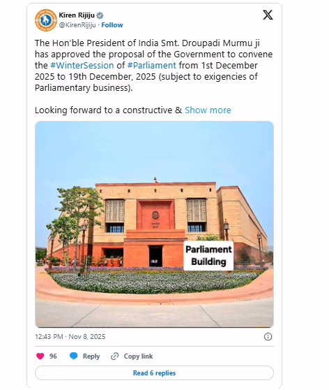 Newdelhi: ಸಂಸತ್ತಿನ ಚಳಿಗಾಲದ ಅಧಿವೇಶನ ಡಿಸೆಂಬರ್ 1ರಿಂದ 19ರವರೆಗೆ ನಡೆಯಲಿದೆ ಎಂದು ಕೇಂದ್ರ ಸಂಸದೀಯ ವ್ಯವಹಾರಗಳ ಸಚಿವ ಕಿರಣ್ ರಿಜಿಜು ಶನಿವಾರ ಮಾಹಿತಿ ನೀಡಿದ್ದಾರೆ.