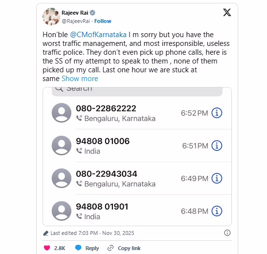 ಟ್ರಾಫಿಕ್ ಕ್ಲಿಯರೆನ್ಸ್ ಪಡೆಯಲು ಪೊಲೀಸರು ಸಂಪರ್ಕಿಸಿದ್ದರೂ ಕರೆ ಸ್ವೀಕರಿಸಲಾಗಲಿಲ್ಲ, ಸುತ್ತಮುತ್ತ ಟ್ರಾಫಿಕ್ ಪೊಲೀಸರು ಕಾಣಿಸಲಿಲ್ಲ. ಇದರಿಂದ ಸಿಟ್ಟಿಗೆದ್ದ ರಾಜೀವ್ ರೈ ಸಿಎಂ ಸಿದ್ಧರಾಮಯ್ಯ ಅವರನ್ನು ಎಕ್ಸ್ನಲ್ಲಿ ಟ್ಯಾಗ್ ಮಾಡಿ ಹರಿಹಾಯ್ದಿದ್ದಾರೆ.