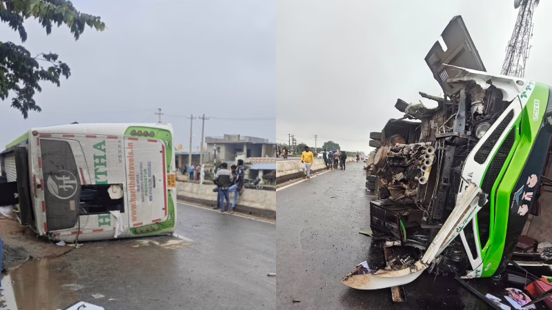 ಬಸ್ ಡಿವೈಡರ್ಗೆ ಡಿಕ್ಕಿ ಹೊಡೆದು ಪಲ್ಟಿಯಾದ ಪರಿಣಾಮ ಆಂಧ್ರಪ್ರದೇಶದ ಪೊದುಟೂರು ಮೂಲದ ಅನಿತಾ (58) ಅಪಘಾತದಲ್ಲಿ ಸ್ಥಳದಲ್ಲೇ ಮೃತಪಟ್ಟಿದ್ದರೆ, ಹಲವು ಪ್ರಯಾಣಿಕರು ಗಂಭೀರವಾಗಿ ಗಾಯಗೊಂಡಿದ್ದಾರೆ.